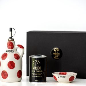 Jarra hecha a mano en Andalucía, decorada con lunares para servir tu Aceite de Oliva Virgen Extra de la mejor manera. Y además, preservarlo con la mayor calidad.